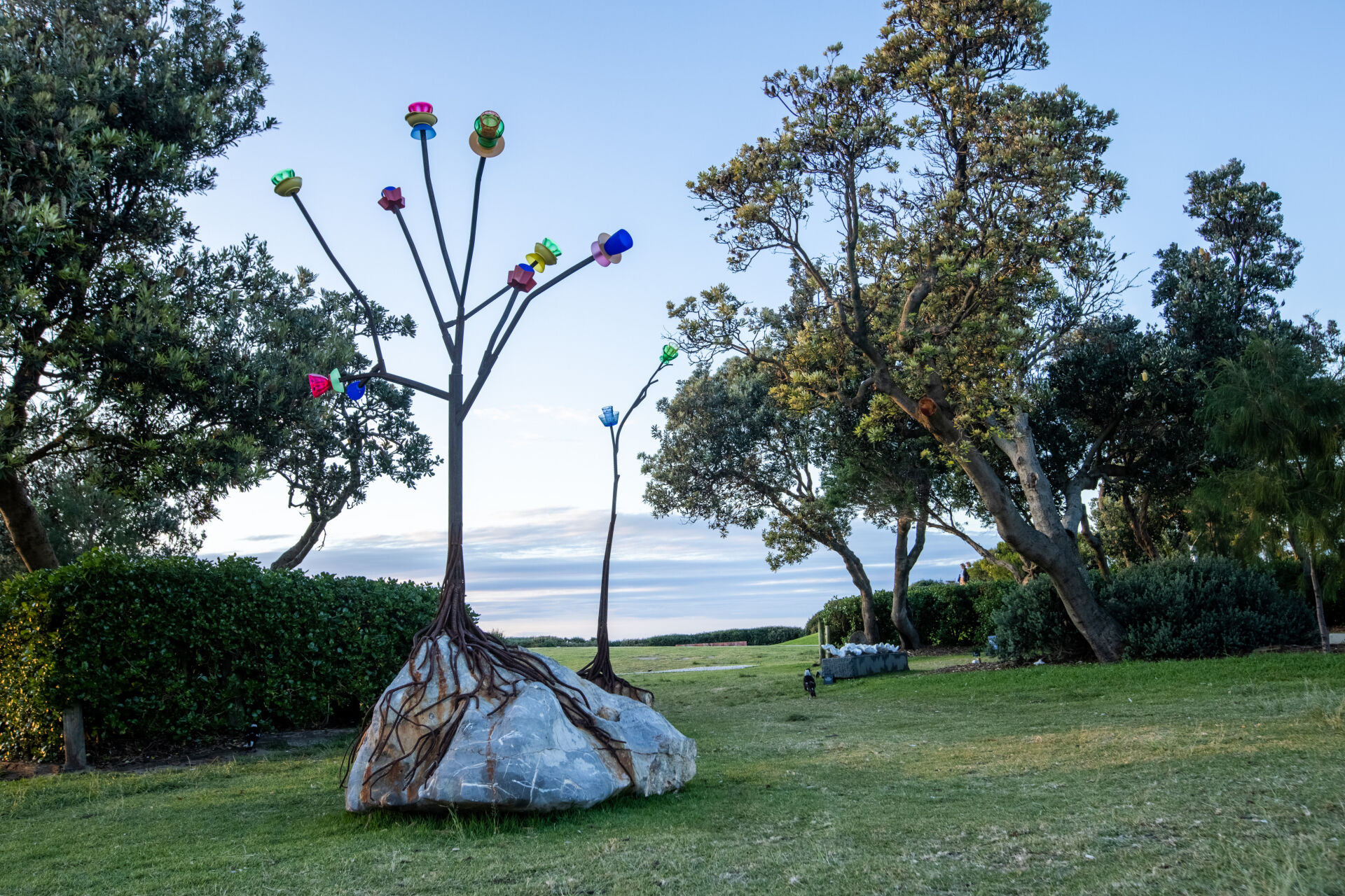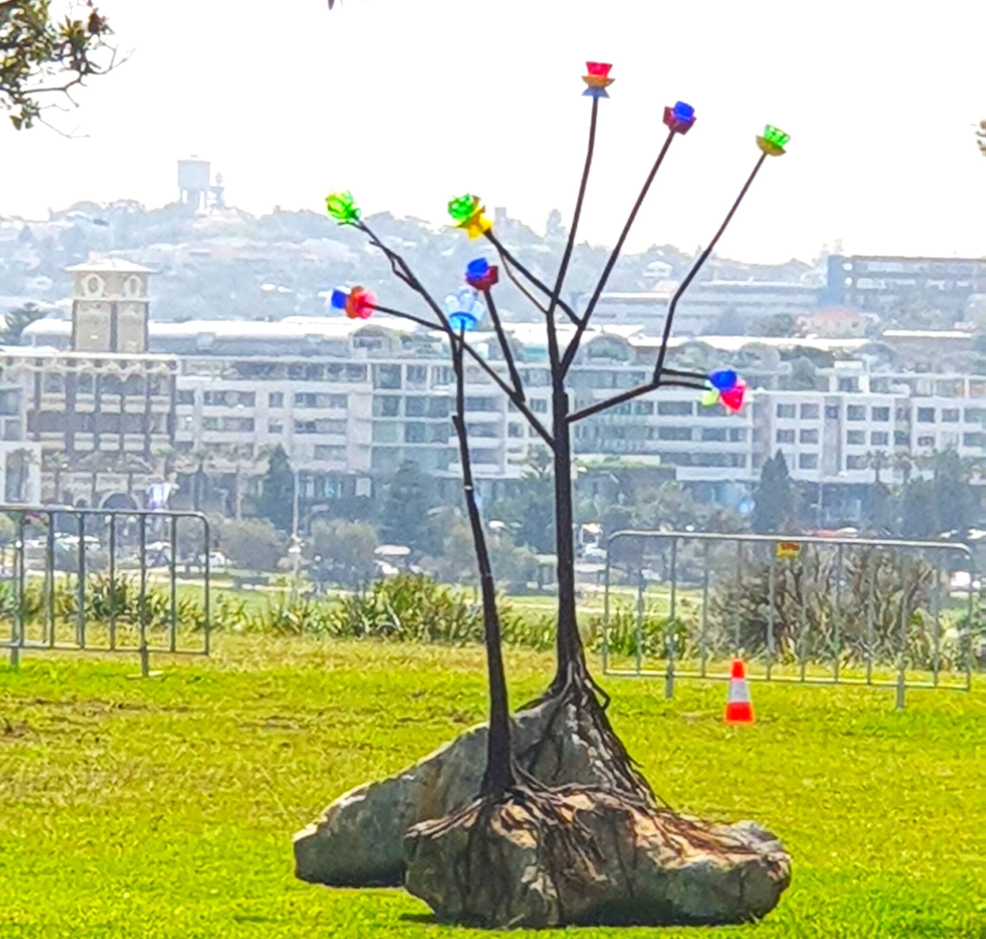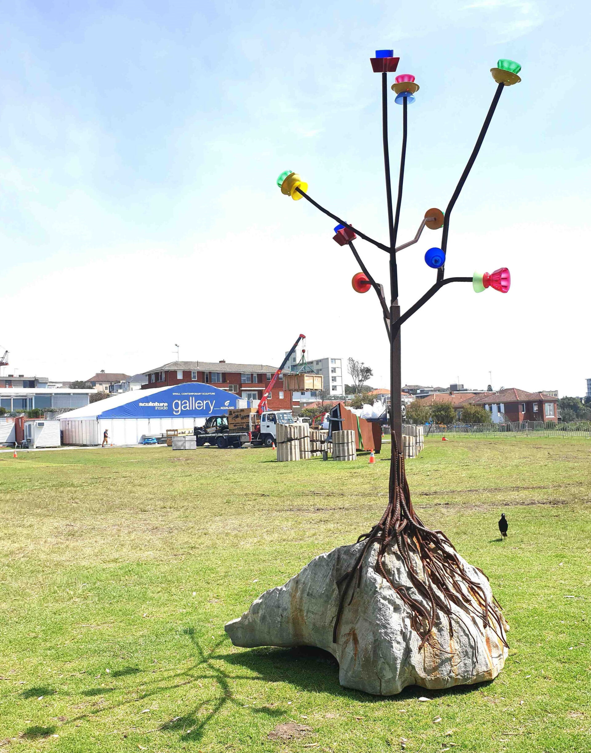 Grafting Cultures is a sample showing a steel form with ‘blossoms’ of coloured plastic cups and bowls. The flowering ‘trees’ are attached by steel ‘roots’ to rocks. It is a sample for an installation that would be on the scale of a park with flower gardens.