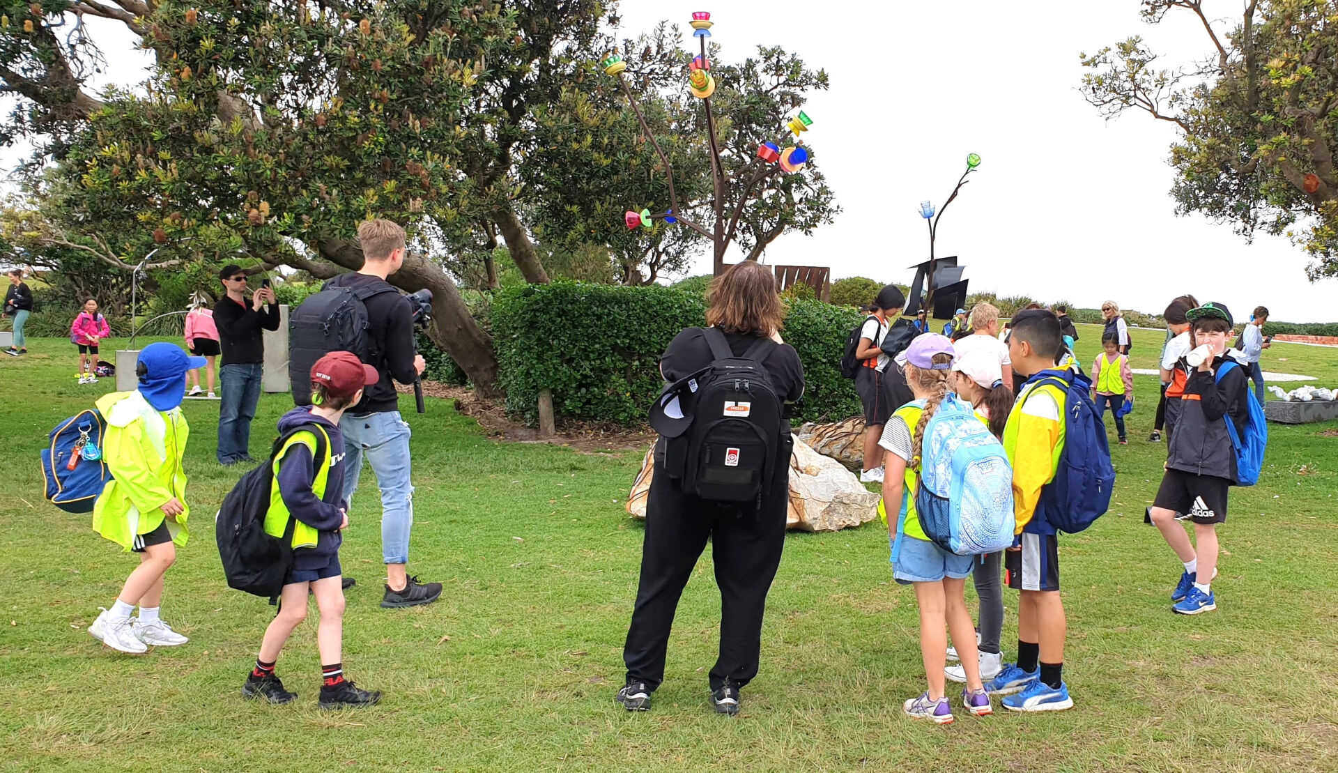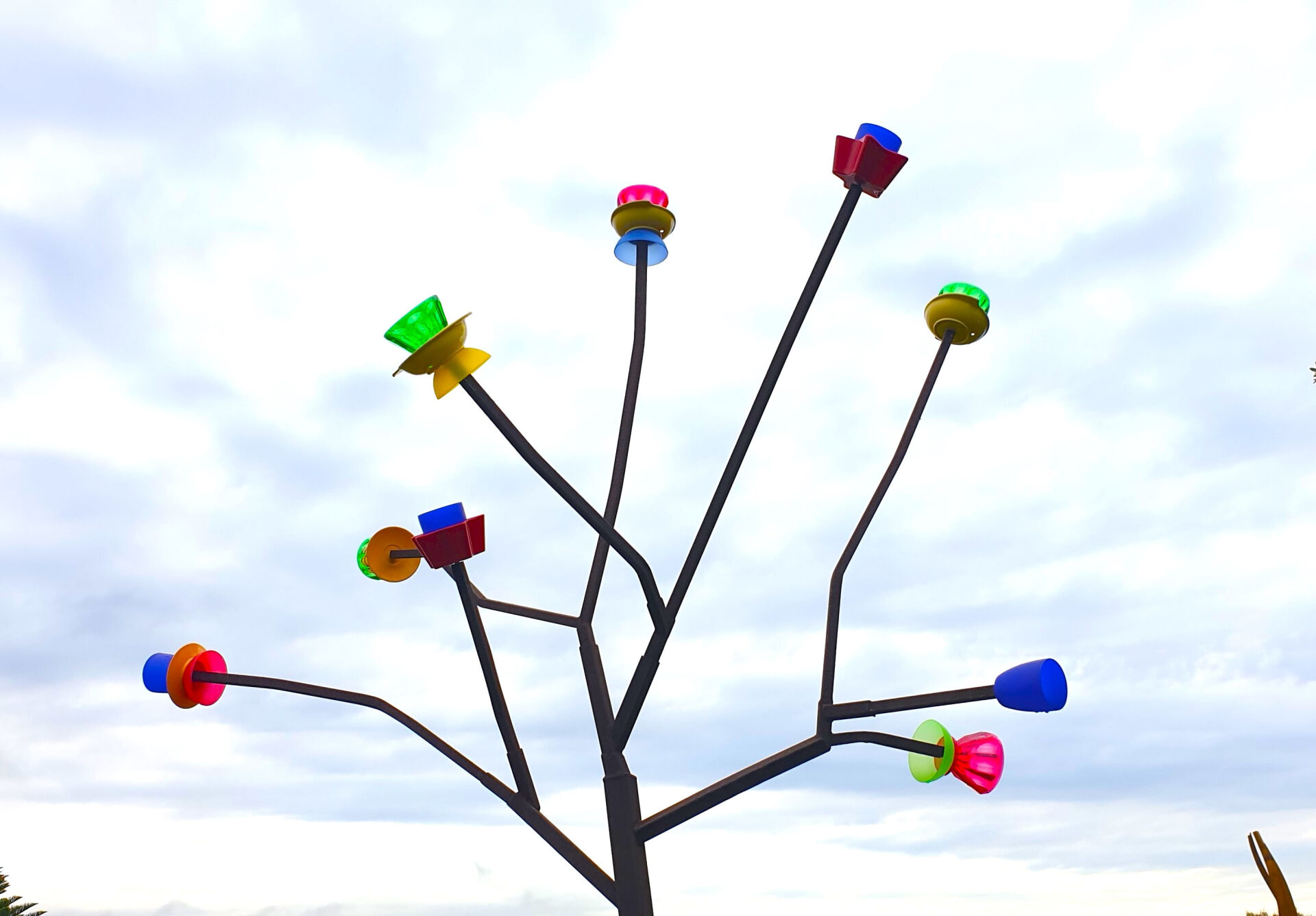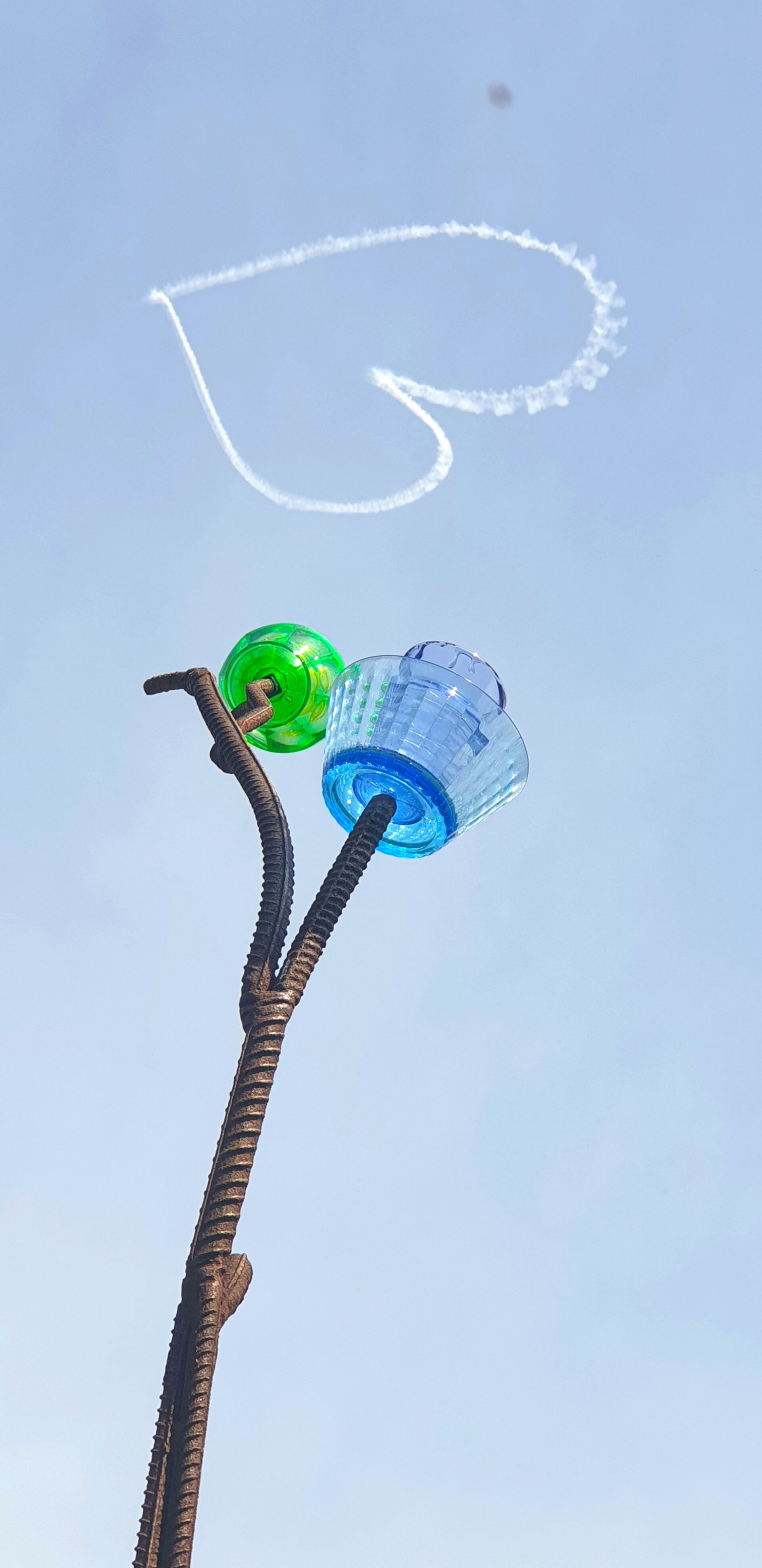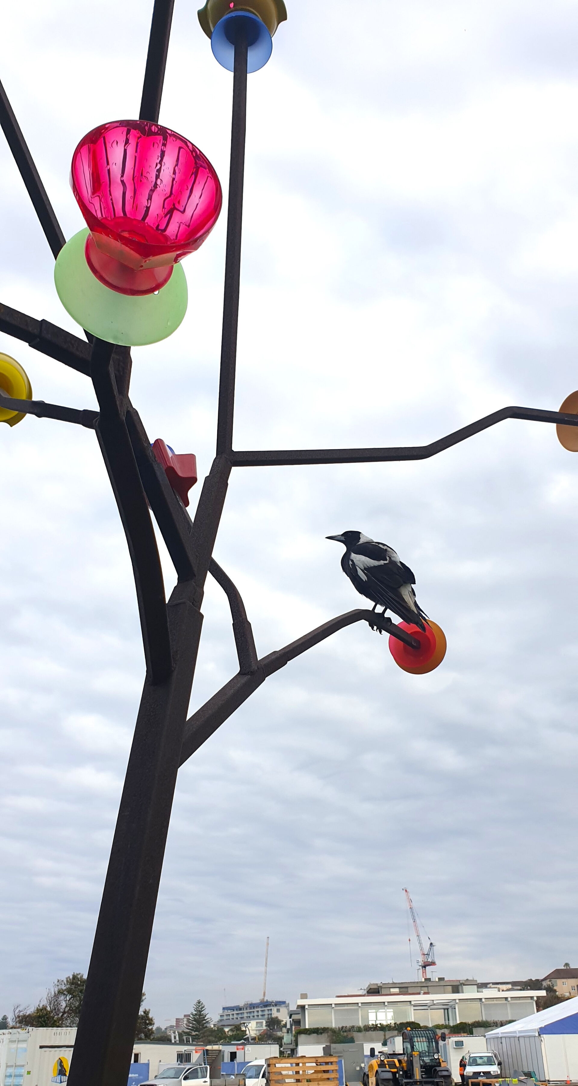 Grafting Cultures is a sample showing a steel form with ‘blossoms’ of coloured plastic cups and bowls. The flowering ‘trees’ are attached by steel ‘roots’ to rocks. It is a sample for an installation that would be on the scale of a park with flower gardens.