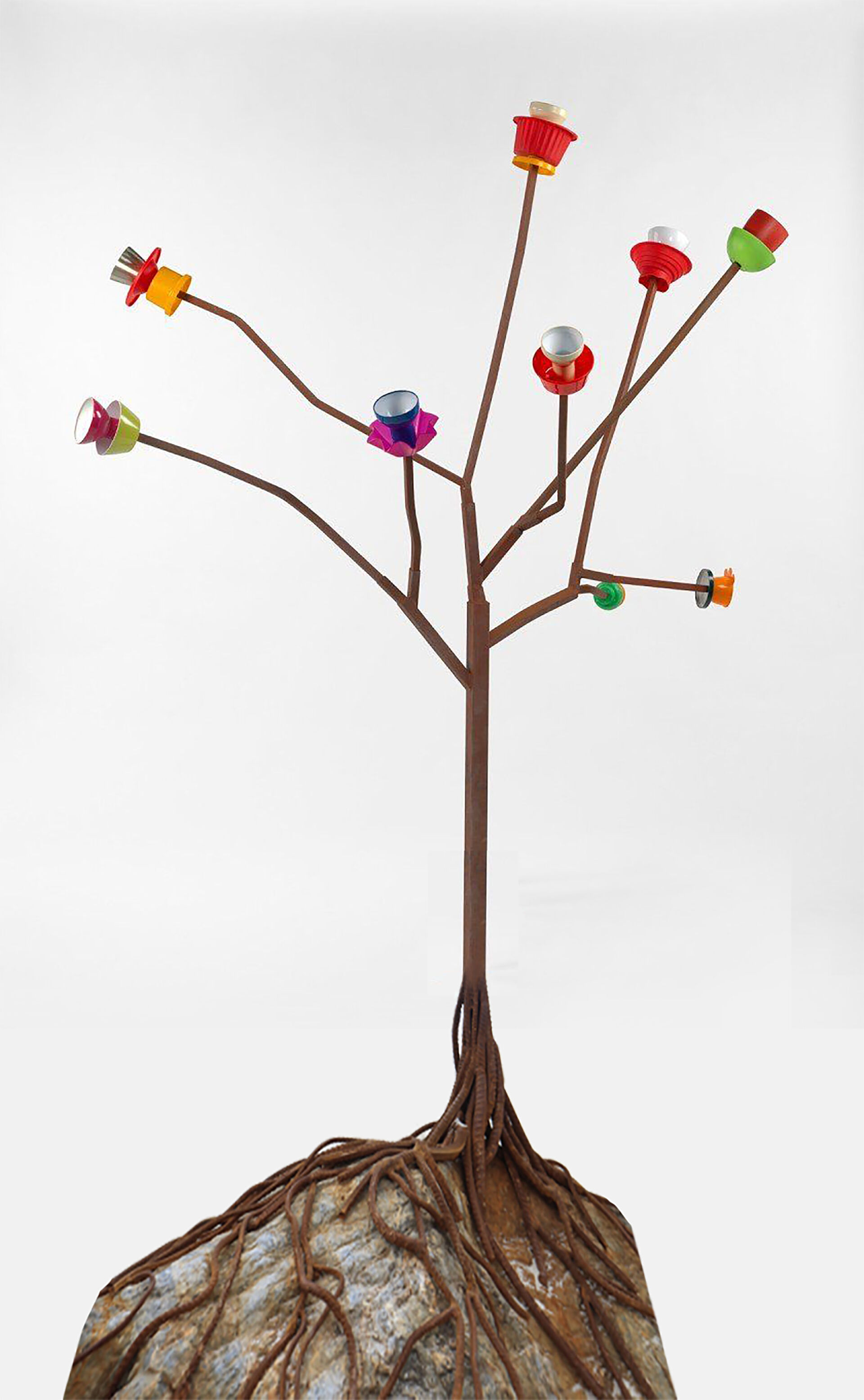 Sculpture representing urbanization and commercialism grafted onto an ancient Chinese stone