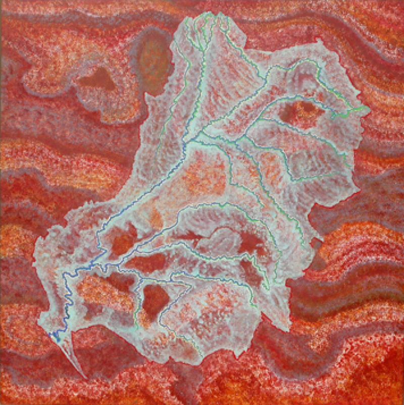 The majority of the water in this land runs under the surface. The Basin is an ecosystem subjected to pressures that threaten its existence, causing some parts to dry out and die off. Here it is likened to a leaf dying.
