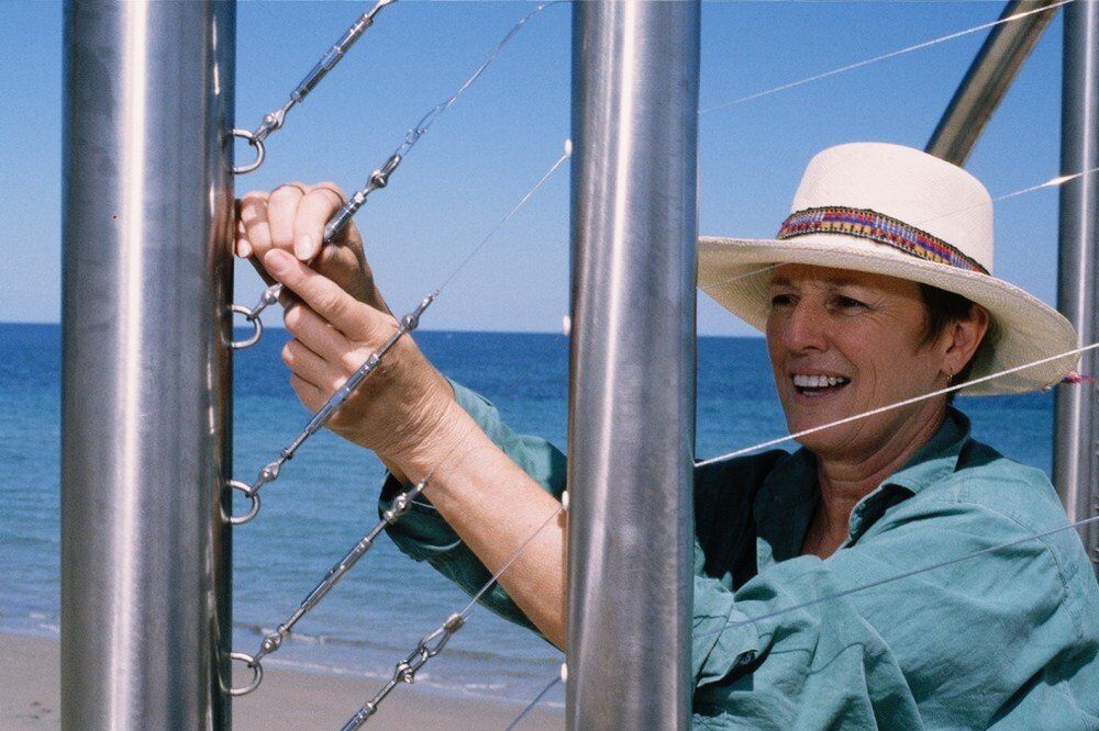 Margaret Worth adjusting Æolian Harp on Brighton Jetty.
