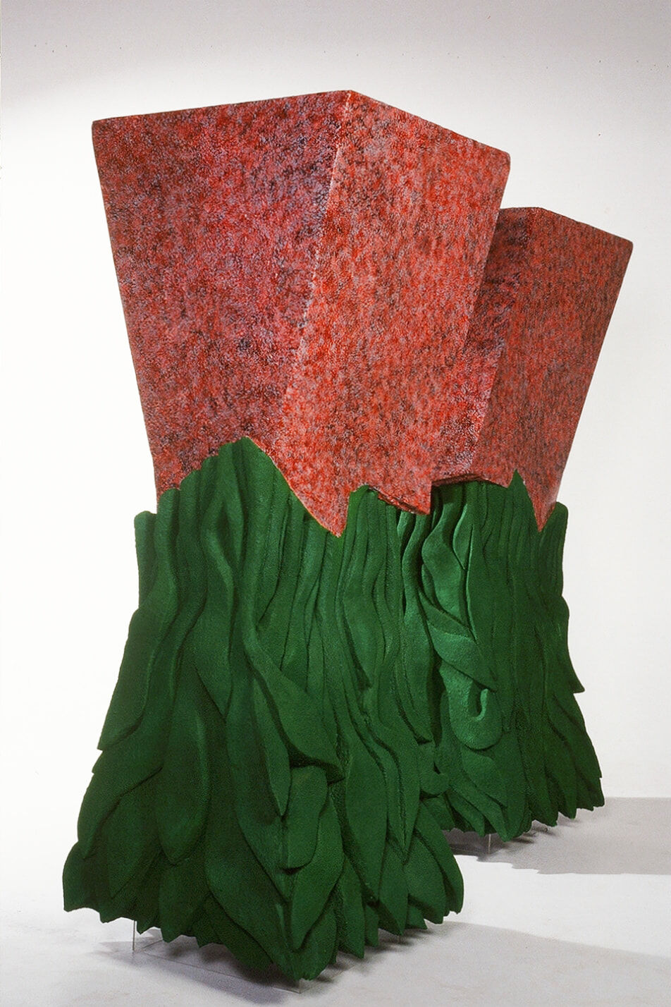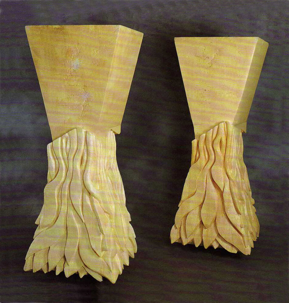 Exhibited Art Gallery south Australia. As markers of a place and a gateway within a journey, they create an experience of the ridiculous and the disturbing. Polystyrene, a derivative of ancient forests, is carved with a pruning saw and ‘fake’-finished into a work responding to an experience of contemporary culture. The forms and surfaces are misleading. Nothing seems familiar and everything looks wrong: massive forms seem to float, the heavy-looking tops break onto artificial-looking ‘plant’ bases, and the surface skins seem unrelated to anything. They reflect a place in time that is out of balance.